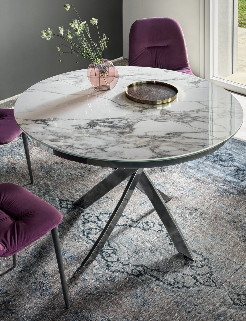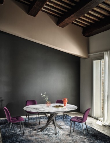 Il tavolo Barone di Bontempi, dallo stile moderno e distintivo, è disponibile in versione fissa o allungabile, con piano rotondo o ovale. Le gambe intrecciate in acciaio donano un tocco scultoreo e raffinato, perfetto per ambienti eleganti e contemporanei. Il piano è disponibile in legno impiallacciato, cristallo, cristallo antigraffio o SuperMarmo, anche con versione "ring" dotata di elemento centrale girevole. Ideale per una sala da pranzo o un soggiorno moderno, unisce design esclusivo e qualità Made in Italy.