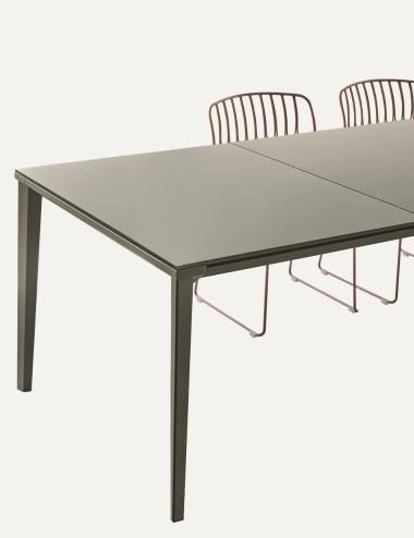 La struttura verniciata in acciaio è disponibile in varie tonalità, offrendo ampie possibilità di personalizzazione. Le finiture permettono di creare giochi di contrasto o composizioni più sobrie, adattando il tavolo al proprio gusto e allo stile dell’ambiente circostante.